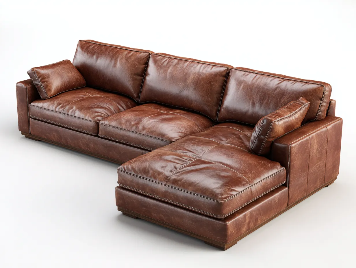 Der Bezug besteht aus Leder in Braun und wird durch eine stabile Konstruktion mit Holzfüßen ergänzt. Die Lederoberfläche zeigt eine natürliche Struktur, die dem Möbel eine warme und charaktervolle Ausstrahlung verleiht. Die Verarbeitung ist auf eine langfristige Nutzung im Wohnbereich ausgelegt.